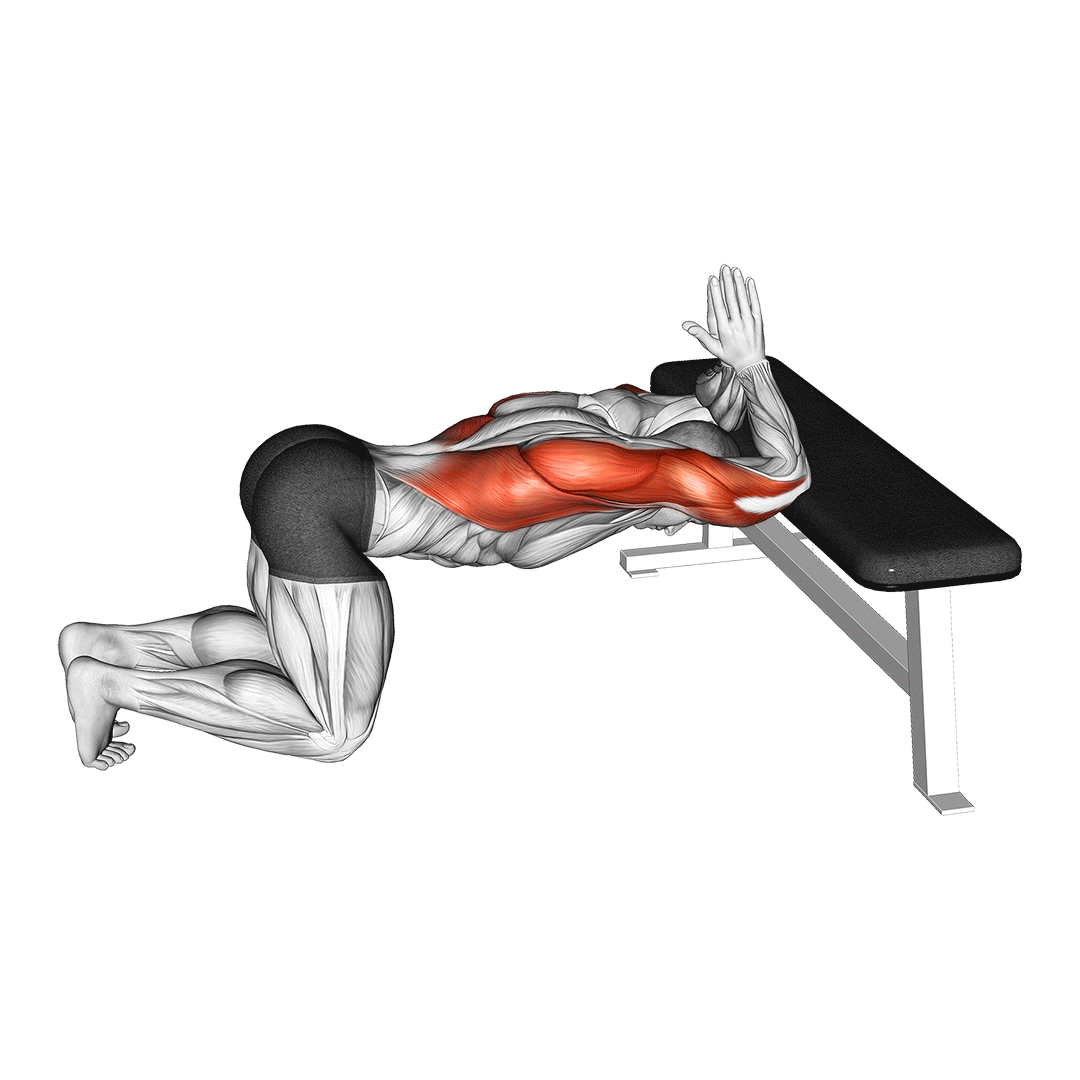 Kneel in front of a bench or chair. Place your forearms or hands on the surface and sit your hips back. Let your chest drop down while keeping your neck neutral.