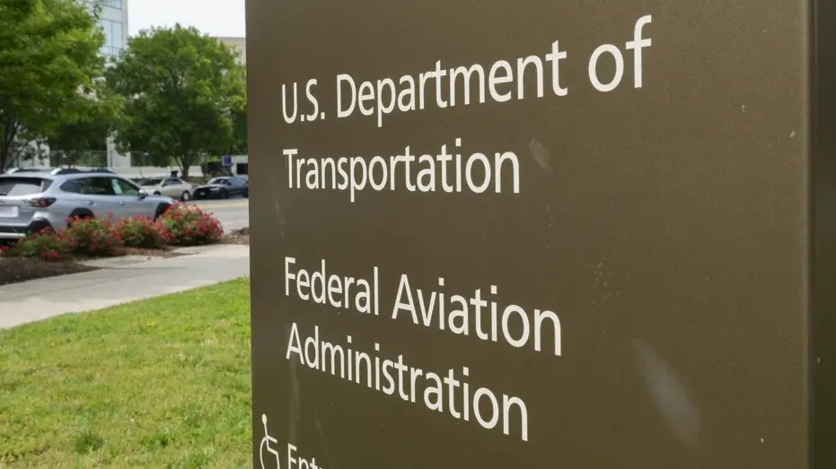 A Department of Transportation banner is displayed outside the Orville Wright Federal Building in June 2025 in Washington, D.C (Kevin Carter/Getty Images/Getty Images)