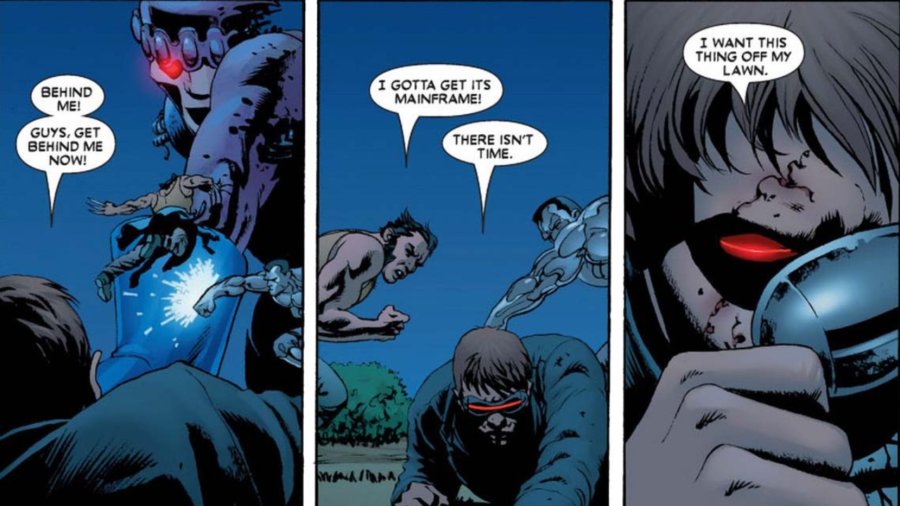 This issue begins with a psychic attack that wipes out the various psychic personalities of the Wolverine wants to attack the robot’s main frame and take it out, but Cyclops tells him: “There’s no time… I want to get this thing off my lawn.” At this point, he takes off his visor, unleashing a massive optic blast that leaves a giant crater and a guard who can’t help but mutter (just before dying) about his master having ambitious plans that go far beyond a simple robot attack.