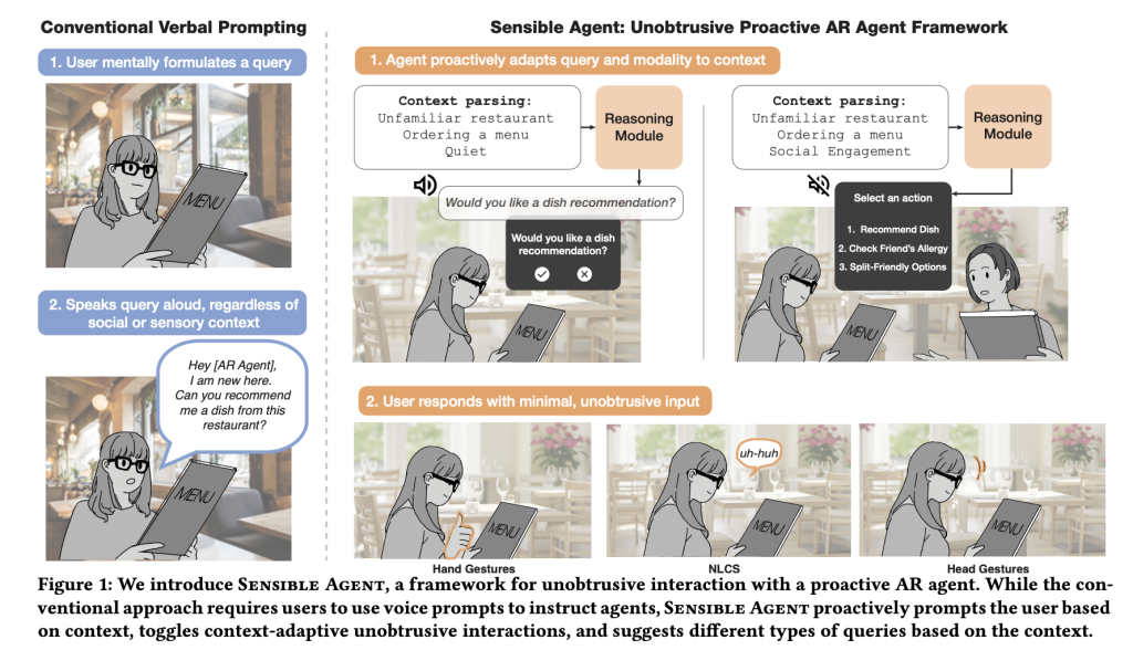 The first audio transformation is fragile: it’s slowly under time pressure, unused with crowded hands/eyes, and embarrassed in public places. The main bet of the reasonable agent is that the high -quality proposal is presented through the wrong channel is an effective noise. Explicit working framework Joint decision From (a) What The agent suggests (recommends/directs/reminds/automated) and (b) how It is presented and confirmed (optical, audio or both; inputs via Nod/Shake/Tilt, look analgesic, finger modes, short rhetoric, or non -strong conversation sounds). By linking the content content to the feasibility of the method and social acceptance, the system aims to reduce the perceived effort while maintaining interest.