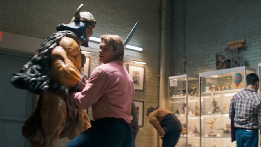 Naturally, that place is Earth, where we’re treated to a montage of depressing things, like Adam’s desk job (with a sign of pronouns) and the disapproval of a co-worker, who appears to be his boss, for his “obsession with nerd stuff.”