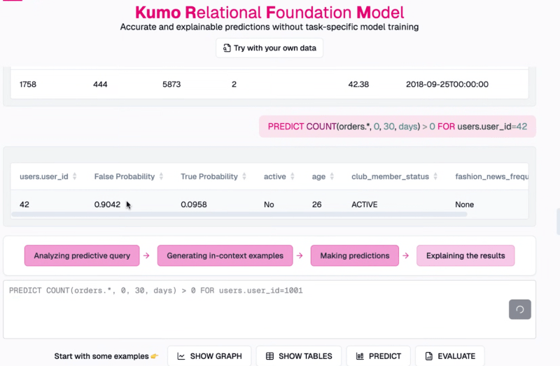 The result is the pre -trained foundation model that can perform predictive tasks on a new database immediately, which is known as “divorced zero”. During the demonstration, Leskovec explained how the user can write a simple query to predict whether a specific customer will apply in the next thirty days. Within a second, the system has restored the degree of possibility and explanation of the data points that led to the end, such as the last user activity or its absence. The model has not been trained on the database provided and adapted in actual time through learning within the context.