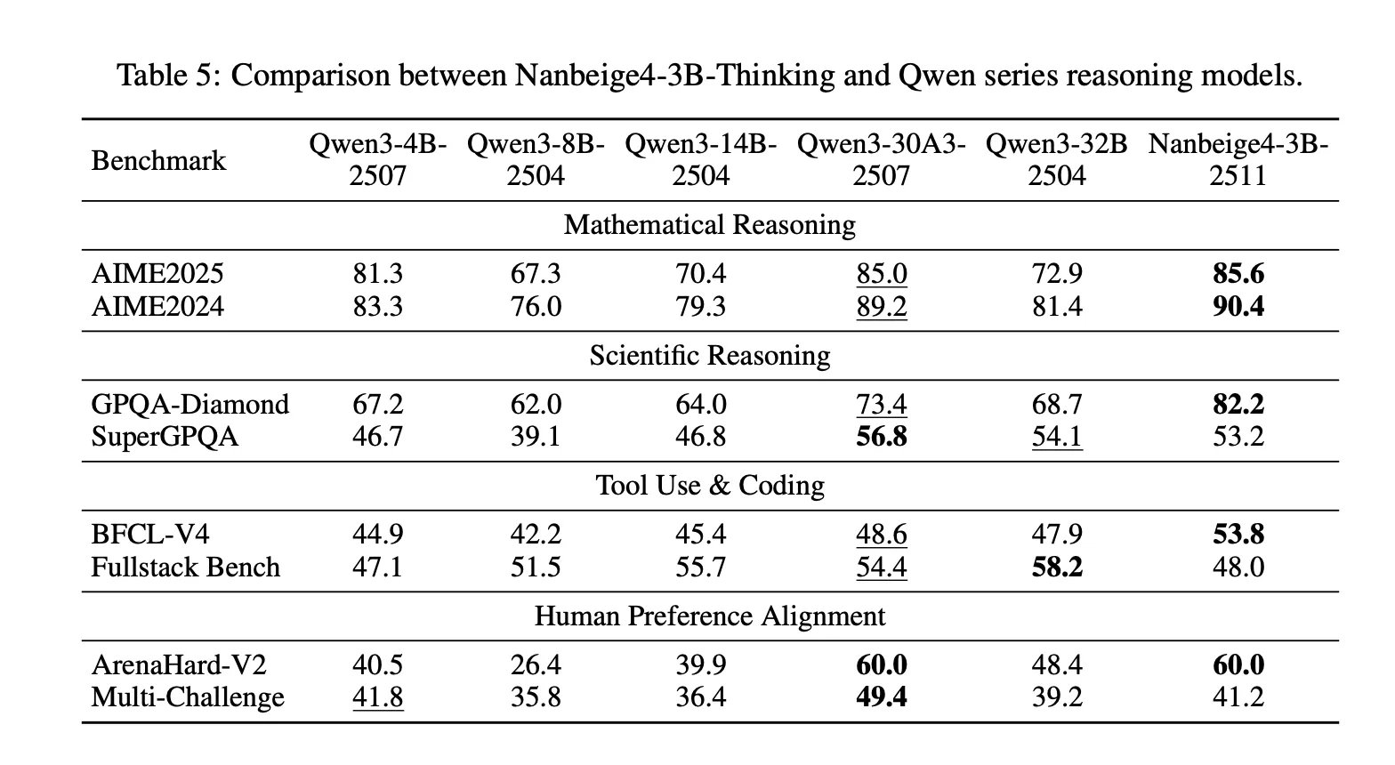 The research team also shows strong gains in tool utilization in BFCL-V4, with Nanbeige4-3B reporting 53.8 versus 47.9 for Qwen3-32B and 48.6 for Qwen3-30B-A3B. In Arena-Hard V2, the Nanbeige4-3B scored 60.0, matching the highest score listed in the comparison table within the research paper. At the same time, the model is not the best in every category, on Fullstack-Bench it is 48.0, lower than the Qwen3-14B at 55.7 and the Qwen3-32B at 58.2, and on SuperGPQA it is 53.2, slightly lower than the Qwen3-32B at 54.1.
