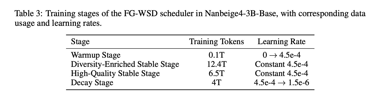 Most similar research projects treat steady-state warm-up decay as a learning rate schedule only. Nanbeige4-3B adds an in-phase stable data approach via FG-WSD, Fine-Grained Warmup-Stable-Decay. Instead of sampling a fixed mixture throughout stable training, they concentrate progressively higher quality data later in training.
