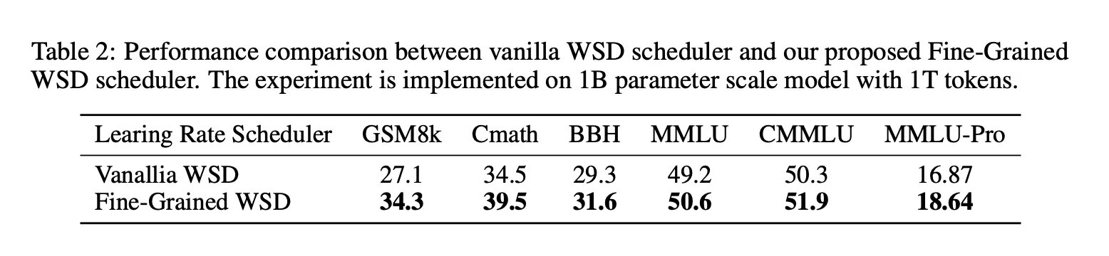 - Pretraining gains are related to data approaches, not just more codes. Fine-grained WSD schedules higher quality mixtures later, and 1B ablation shows GSM8K moving from 27.1 to 34.3 versus vanilla scheduling.