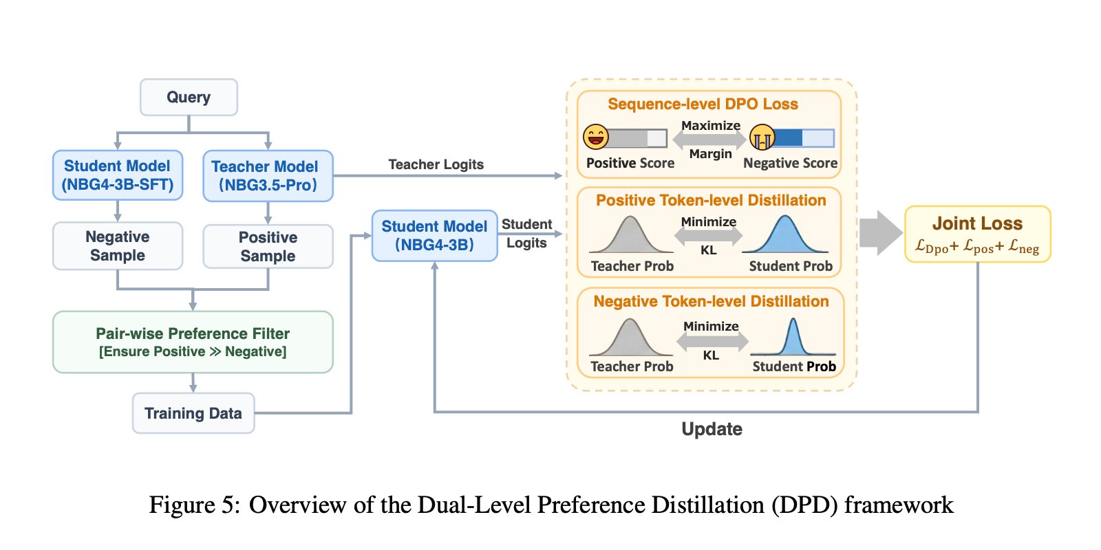Distillation uses the preferred two-level distillation, DPD. The student learns symbol-level distributions from the teacher model, while the sequence-level DPO objective maximizes the margin between positive and negative responses. The positives are sampled from the teacher Nanbeige3.5-Pro, the negatives are sampled from the student 3B, and distillation is applied to both types of samples to reduce confident errors and improve alternatives.