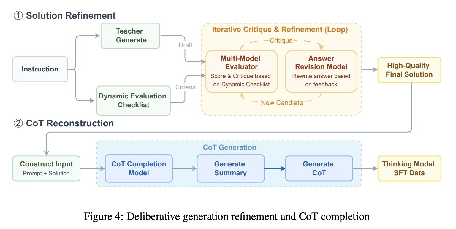 SFT generally turns out to be a combination of 64KB context length including general conversation, writing, agent style tool use, planning, more difficult reasoning targeting vulnerabilities, and programming tasks. This stage provides improvement of the solution as well as reconstruction of the chain of ideas. The system runs iterative generation, critique, and review cycles guided by a dynamic checklist, and then uses a chain completion model to reconstruct a coherent CoT that conforms to the final refined solution. This is intended to avoid training broken heuristics after extensive editing.