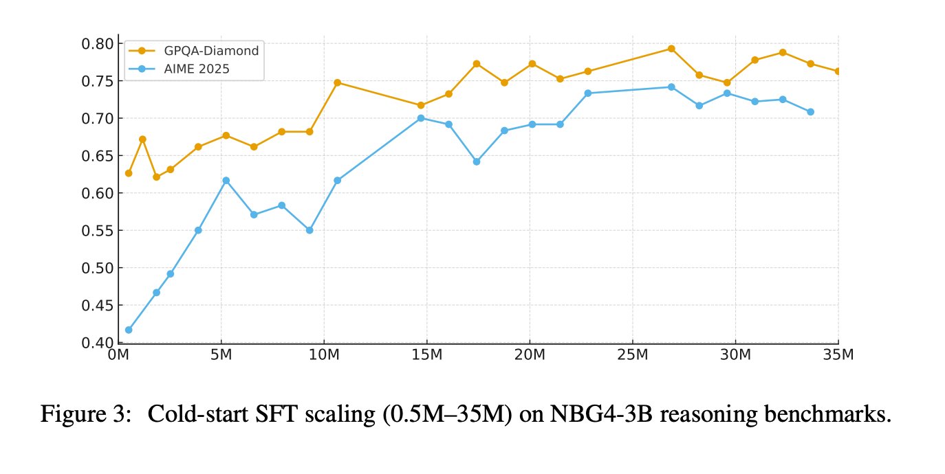 Subsequent training begins with cold start SFT, then general SFT. The cold start phase uses approximately 30M QA samples focused on mathematics, science, and code, with a context length of 32K, and a reported mix of approximately 50% mathematical reasoning, 30% scientific reasoning, and 20% code assignments. The research team also claims that scaling cold start SFT instructions from 0.5M to 35M maintains the improvement of AIME 2025 and GPQA-Diamond, with no early saturation in their experiments.