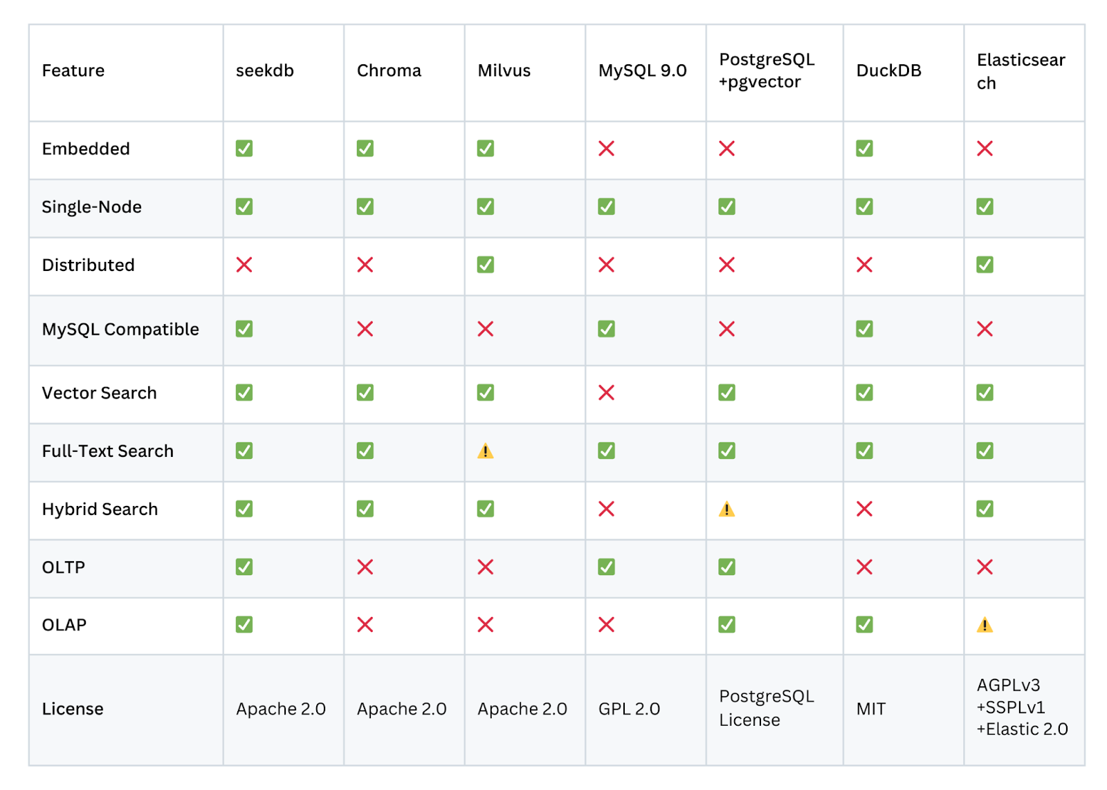 - Open source ecosystem and tools: Seekdb is open source within Apache 2.0 and integrates with the growing ecosystem of AI tools and frameworks, with Python support via pyseekdb and MCP-based integration for code helpers and agents, so it can serve as a unified data plane for AI applications.