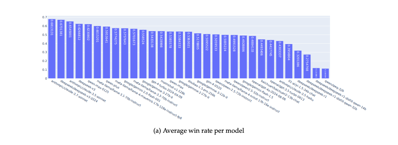 According to preliminary experiments with the Arena supplement, the most performance performance model is Claude 3.7 Sonnet, Deepseek V3-0324, Claude 3.5 Sonnet, Deepseek V3 and QWEN Max-0125.