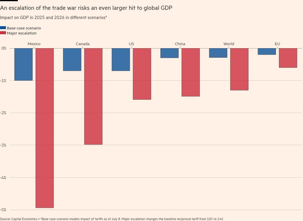 Modeling by Capital Economics, a consulting company, was found that the high -escalation trade war has reached the average mutual tariff rate to 24 percent that would cause 1.3 percent of GDP over two years, compared to 0.3 per cent in an essential condition that remained 10 percent.